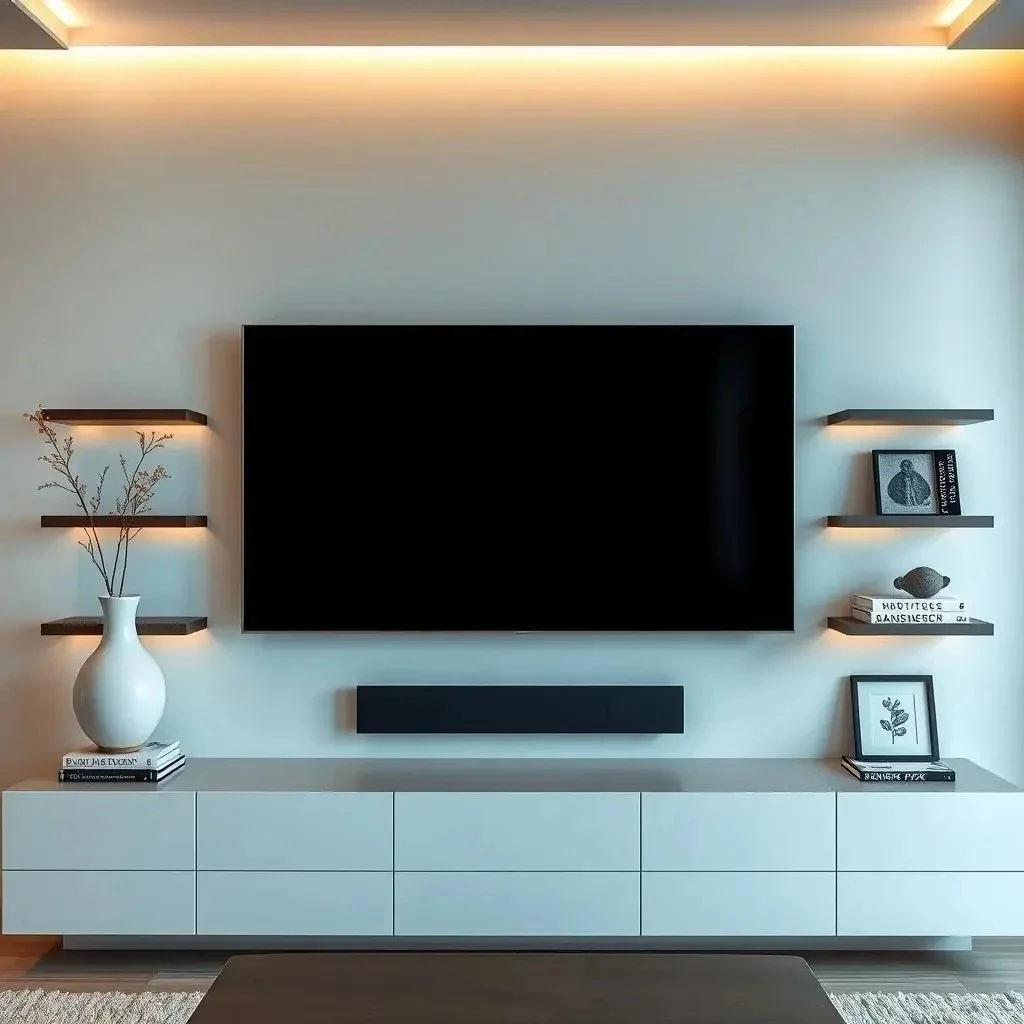 - Минимализм: Простые формы, нейтральные цвета, отсутствие лишних деталей. Телевизор может быть встроен в стену или скрыт за панелью. Кабели полностью скрыты.
